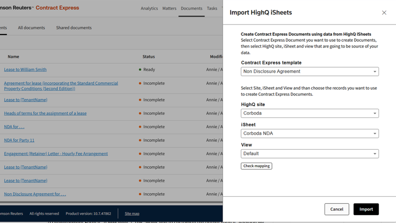 - DMS integration: Complete your document management process by connecting your iManage, NetDocuments, SharePoint with your instance of Contract Express.