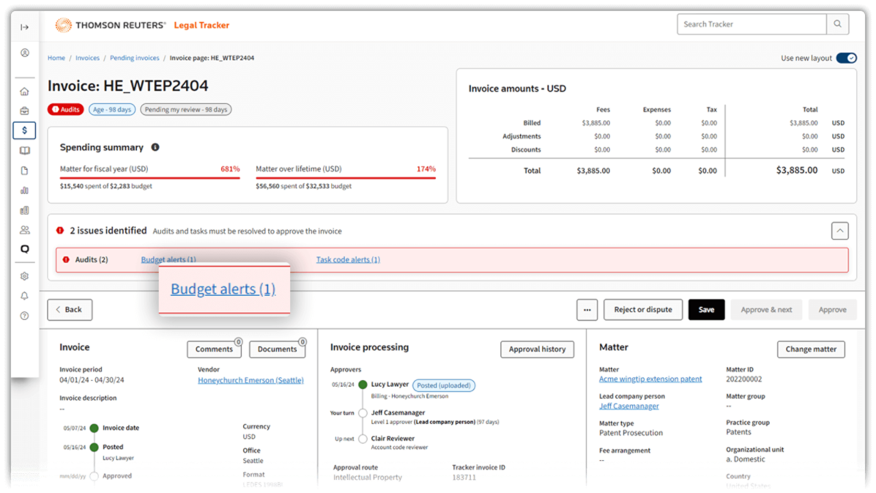 - Automated invoice review: Audit invoices from external counsel through a Thomson Reuters patented invoice hold workflow - the only solution that ensures invoices are processed only after required matter budgets, status, and matter updates are completed.